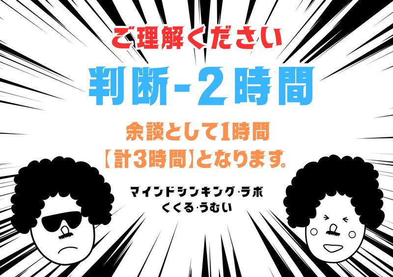 申込みフォームのシステムの関係上、判断時間が4時間となっていますが、実質、判断時間は時2間+余談1時間(計3時間)です。