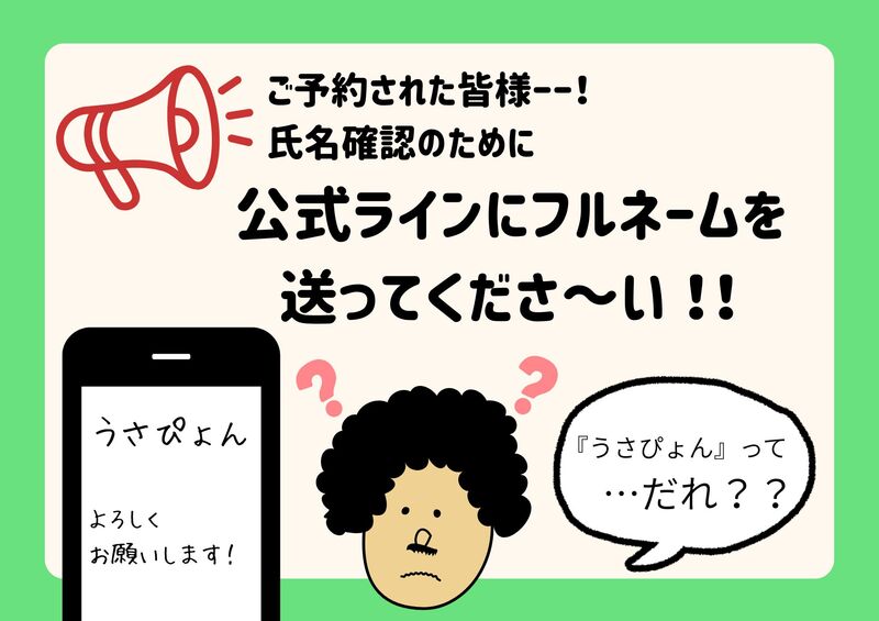 公式ラインはニックネームでご登録の方が多いため、必ず【ご予約時の本名】をご記載ください。